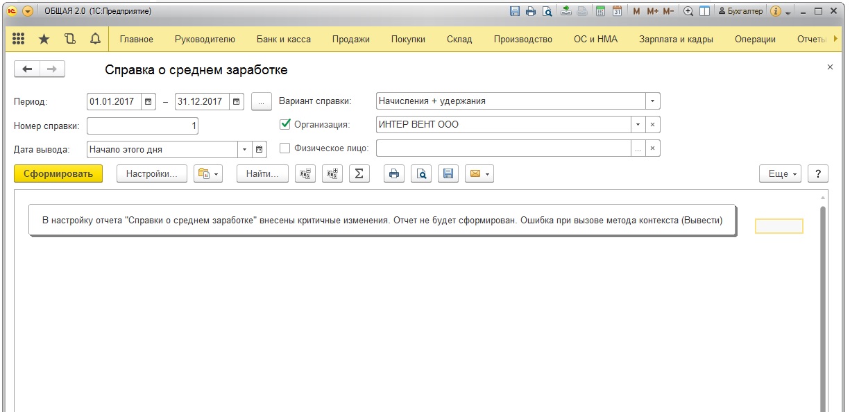 Необходимо наладить работу внешнего отчета Справка о среднем заработке для 1С Бухгалтерии ред. 3.0. После обновления до версии 3.0.57.10 перестал формировать справки, в предыдущих релизах справки формировались корректно.