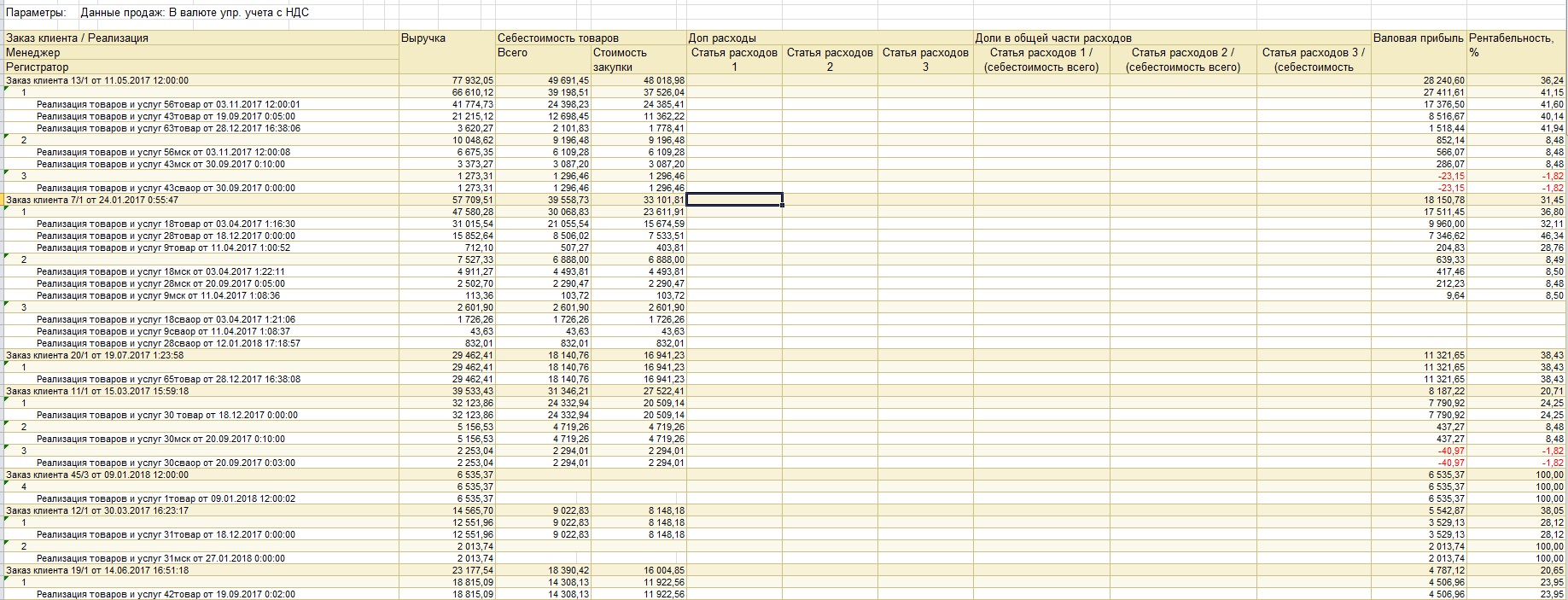 Необходимо доработать отчет валовая прибыль предприятия в УТ 11.4.1.261 таким образом, чтобы доп расходы разбивались по существующим статьям расхода(если по ним есть какие то значения в выбранном периоде). Доп расходы образованы статьями расходов отнесенными к поступлениям и распределены на себестоимость.Также добавить вычисляемые поля по такому же принципу, высчитанные как доля этих расходов в общей себестоимости. пример как должно выглядеть до и после в прикрепленных файлах