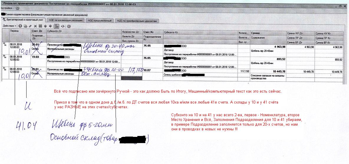 Конфа Бухгалтерия Предприятия Проф 2.0.66.46 переписанная (CF-файл только Исполнителю), Документ Поступление из переработки (Вкладка Производство-Передача в Переработку - Док. Поступление из Переработки) он типовой на сегодня. Нужно изменить результат его проведения (проводки - вкладка Бухгалтерский и налоговый учёт по кнопке результат проведения). На одну заполненную строку в табличной части этого дока (во вкладках заполнено одновременно: Вкладки - Услуги и Материалы) документ формирует Три Проводки (по двум заполненным строкам Услуг и Материалов - 6 проводок и т.д. и т.п.), одна из трёх этих проводок на НДС Верная, Две Другие И нужно ИЗМЕНИТЬ программным кодом. Вместо ДТ 20 в примере, нужен выбор (в табличной части дока) ДТ 10 ИЛИ ДТ 41 со своими субконтами (номенклатура, склады) по плану счетов и выбор склада д.б. не Один Склад в доке, а возможность выбора складов Построчно для каждой номенклатуры так-же в любой табличной части этого дока (вкладки Материалы/Услуги), Вкладку Дока Счёт Затрат - Игнорировать, Либо убрать совсем из данного дока. Всё остальное оставить как есть в данном доке.