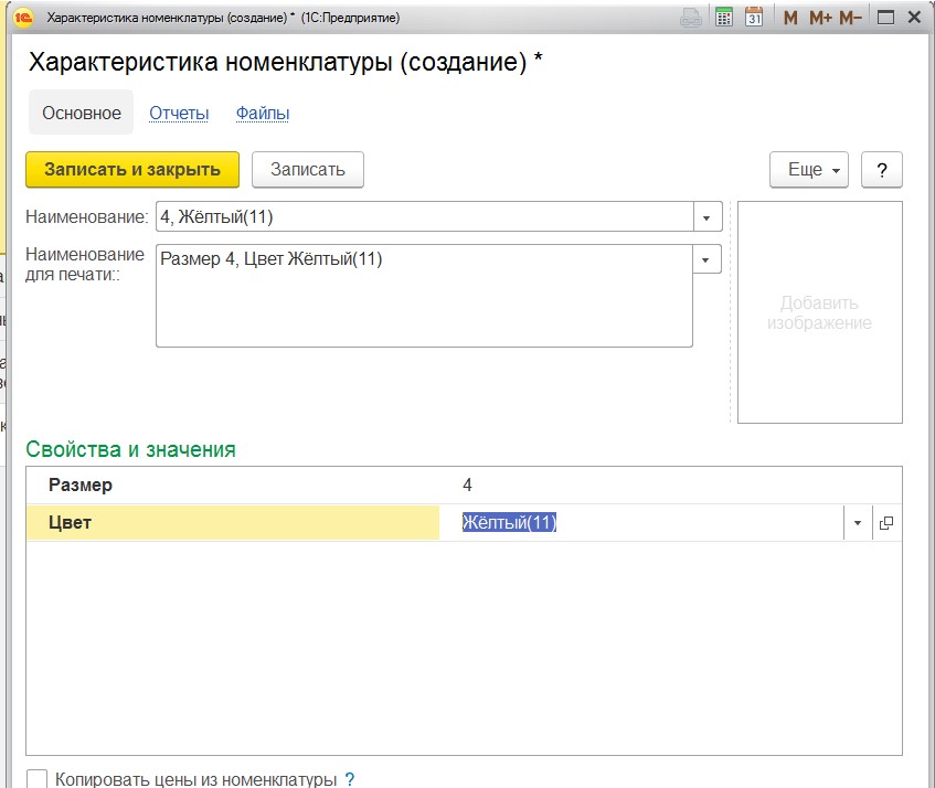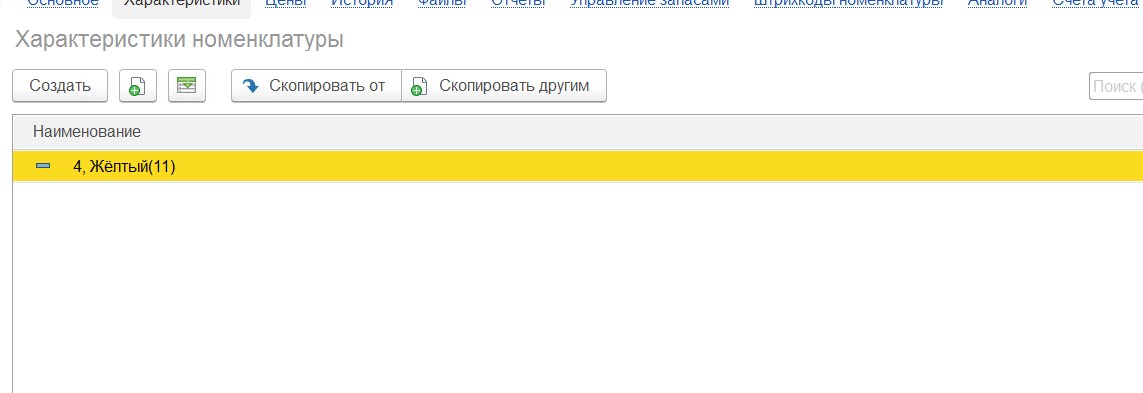 При создании вручную позиции номенклатуры категории обувь (в которой прописан этот же общий список свойств характеристик), если ранее не создавал сочение 1, то создаю вручную 1 красный и получаю характеристику 1, Красный.