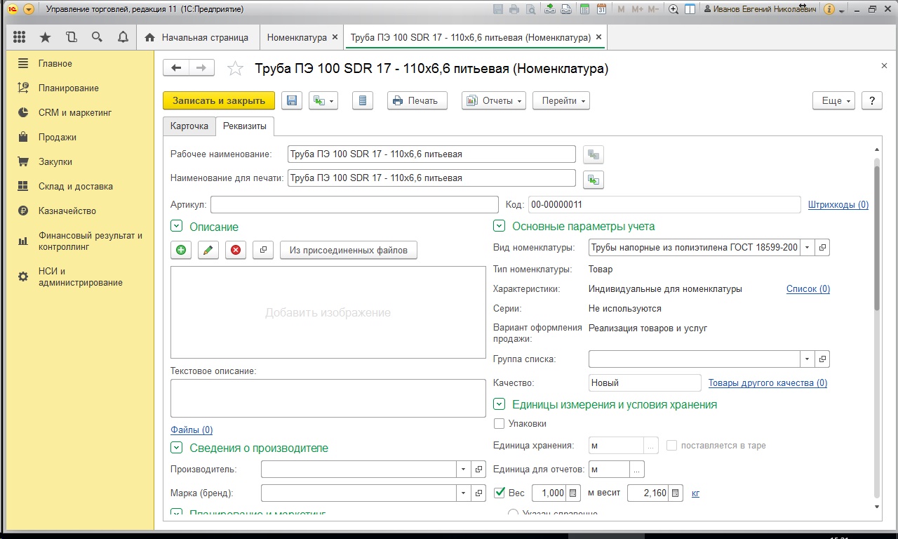 Номенклатура - трубы хранятся в метрах, но также есть вес метра. Важно загрузить с весом за метр. Приложен образец - скрин характеристик номеклатуры.