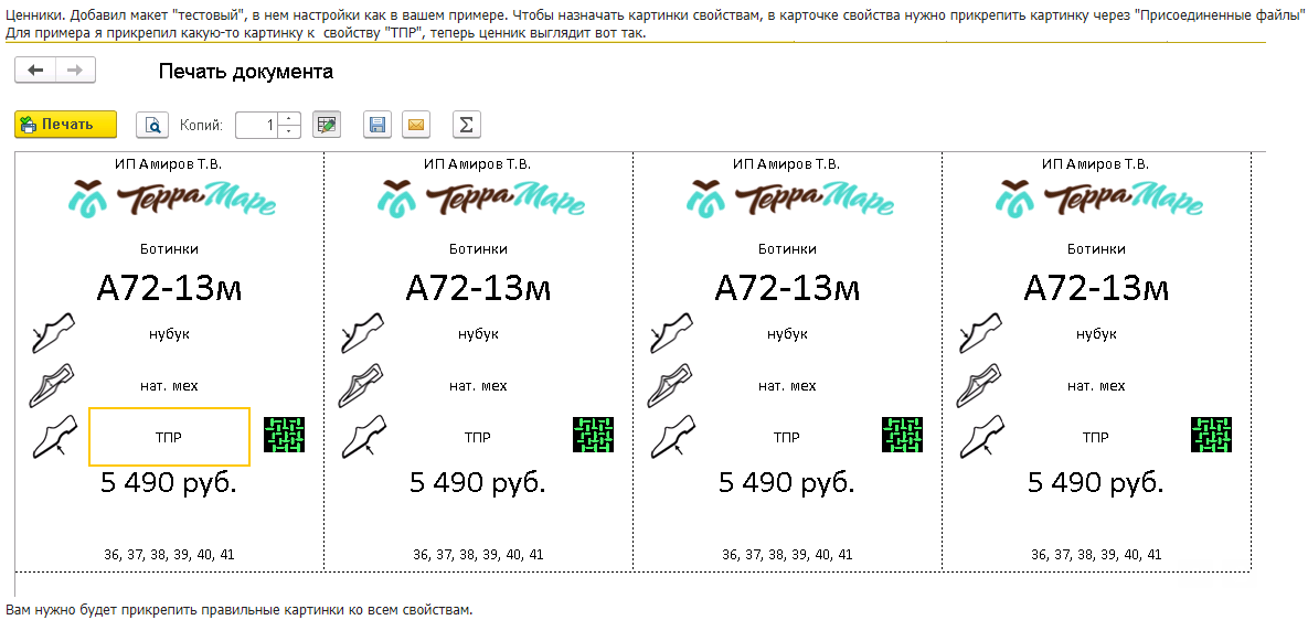 Сейчас после обновления у свойств номенклатуры "Материал верха", "Подкладка" и "Подошва" пропала возможность присоединить файл картинки. Поэтому ценники выглядят вот так: