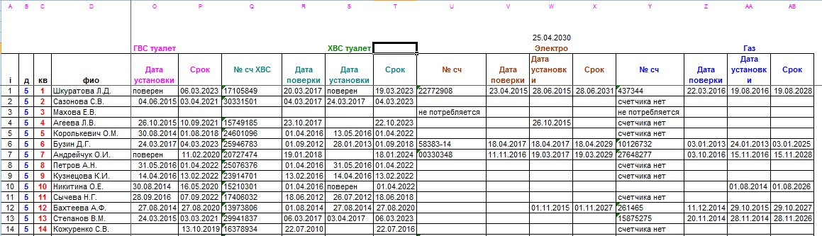4. Список установленных в квартирах счетчиков (4 счетчика в каждой квартире)