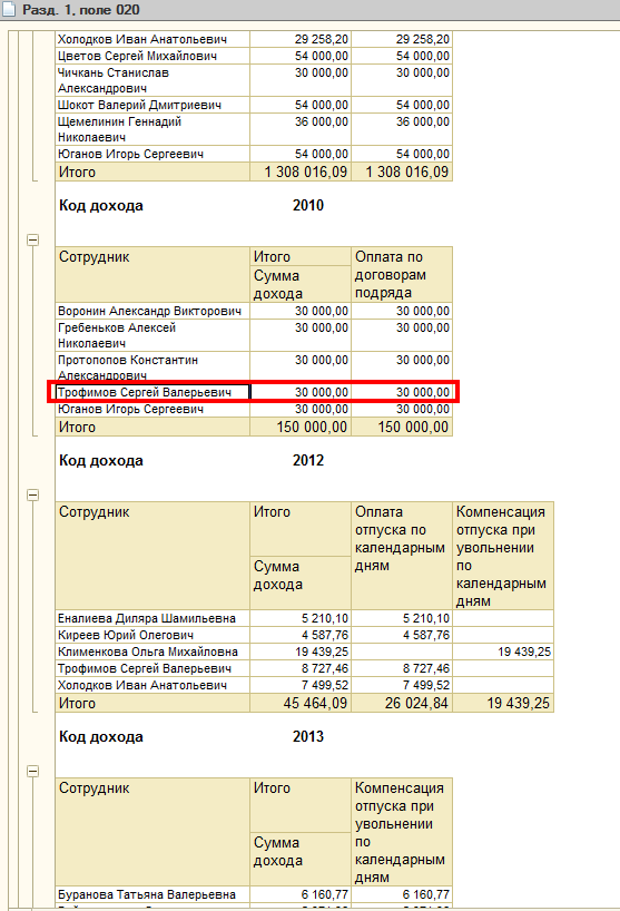 2. В отчете 6-НДФЛ за 1 кв 2018 в Разделе 1 в расшифровке по строке 020 по коду дохода 2010 у Трофимова стоит 30 000 руб, хотя договор ГПХ у него заканчивается в феврале и по идее должно быть 20 000 руб
