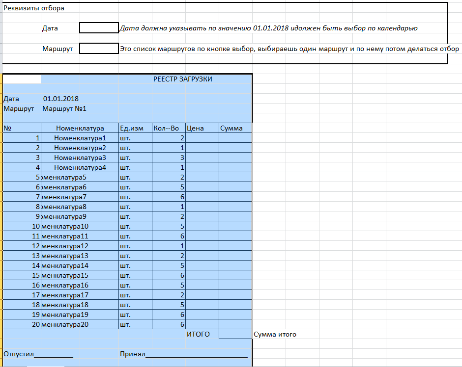 Описание: Оператор забивает Реализации ТМЦ по контрагентам в котором указывать Торгового агента (Это реквизит подразделение, но с ним ты не работаешь ) и Маршрут (Маршрут это Машина в которую будет грузиться товар, реквизит Грузополучатель, это справочник Контрагенты Там будет папка Маршруты и в них будут Маршрут 1, Маршрут 2 ит.д.)Оператор создал документы и переходит в отчет который нужно написать форма ниже