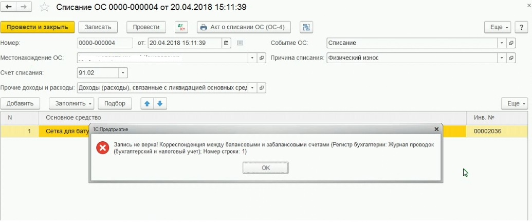 Здравствуйте, у нас при списании ОС возникает ошибка: "Запись не верна! Корреспонденция между балансовыми и забалансовыми счетами (Регистр бухгалтерии: Журнал проводок (бухгалтерский и налоговый учет); Номер строки:1)". Необходимо создать обработку, которая бы отключала данную блокировку, давала списать ОС и затем была возможность включить эту блокировку обратно. Скриншот ошибки прилагаю.