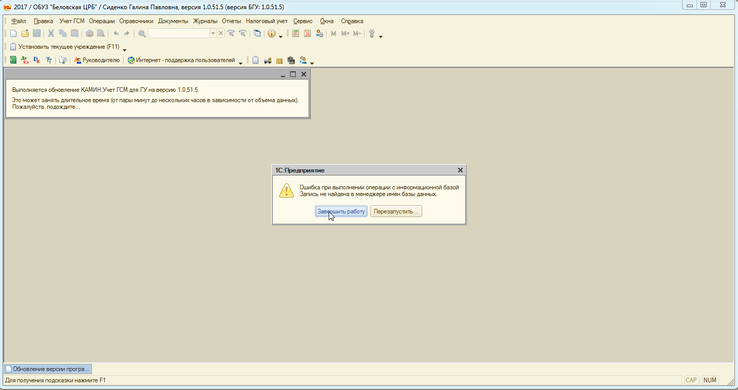 БГУ ред.1 (Камин Учет ГСМ 1) Ошибка при обновлении с релиза 1.0.50.9 и тестировании базы.