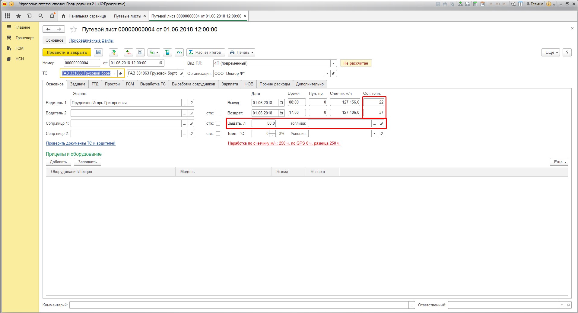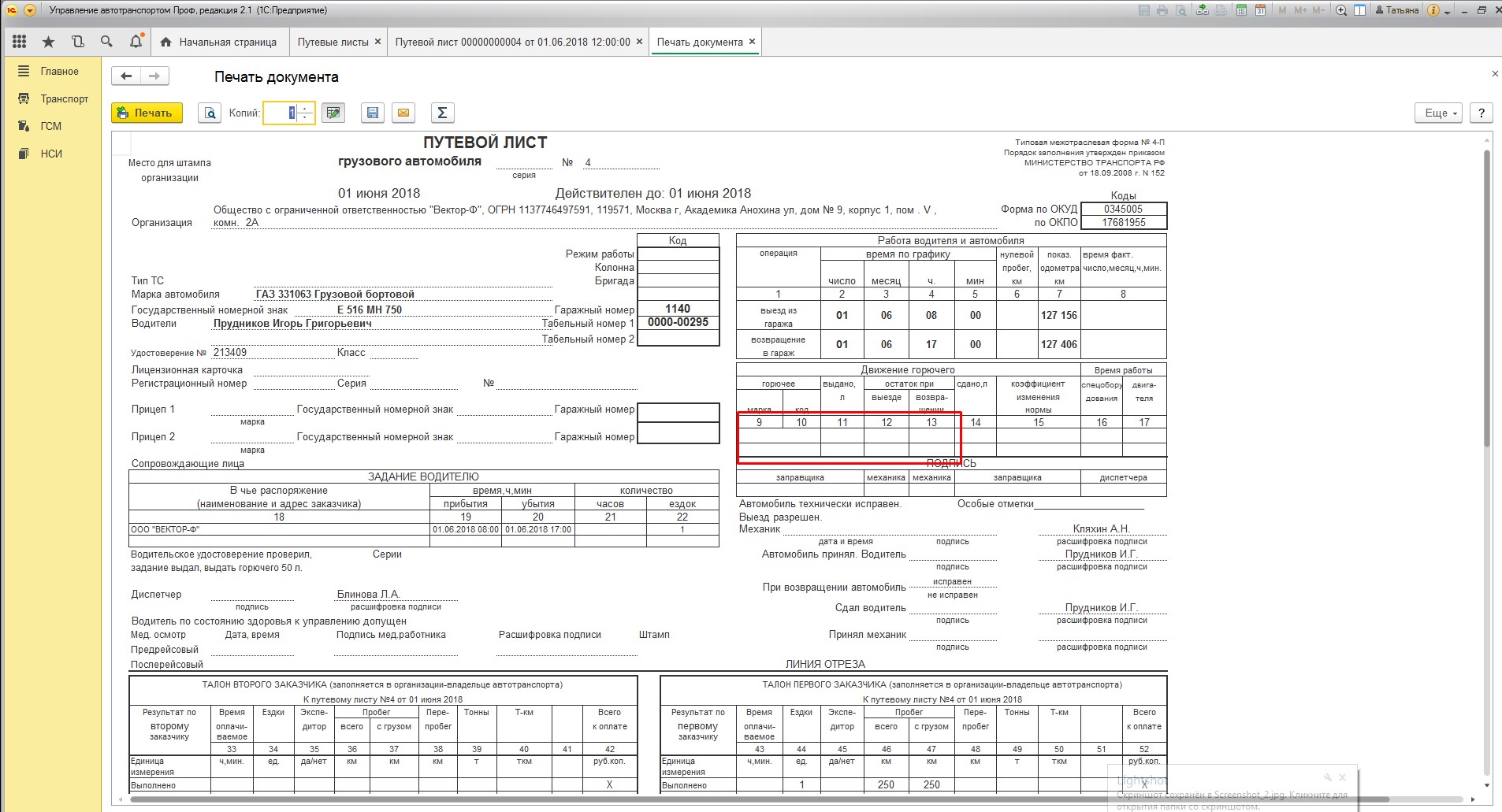 При печати ПЛ поля "горючее и остаток при выезде/возвращении" пустые