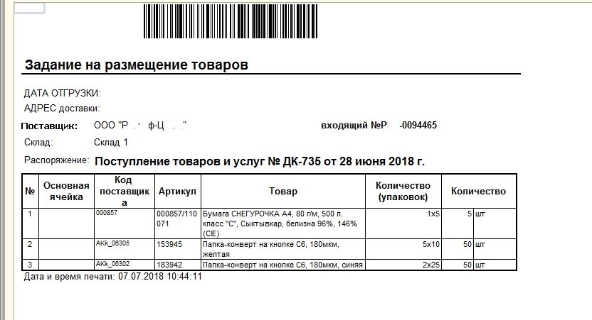 УТ 11.3 Внешняя печатная форма поступления товара (название: Задание на Размещение товара) Формируется на основании НЕПРОВЕДЕННОГО документа поступления.