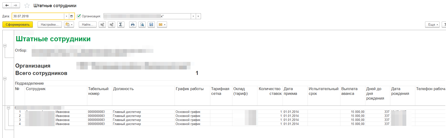 Требуется разобраться в причине и устранить её. После перехода с ЗБУ на ЗГУ отчет "Штатные сотрудники" затраивает/зачетверяет некоторых сотрудников, выводит в отчет по несколько раз (см скриншот). Причем в поле "Итог" (в шапке отчета) выводится верное количество. Все остальные кадровые/расчетные отчеты по "проблемным" сотрудникам формируются корректно. Доступ к базе- по Тимвьюверу. PS . Базу тестировал, святой водой окроплял, с бубном вокруг компа бегал.