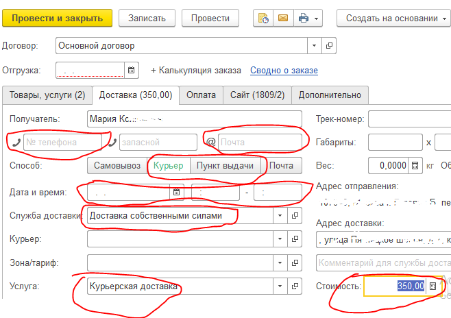 Требуется доделать связку полей, которые клиент заполняет при заказе на сайте (должны попадать в 1С), например:
