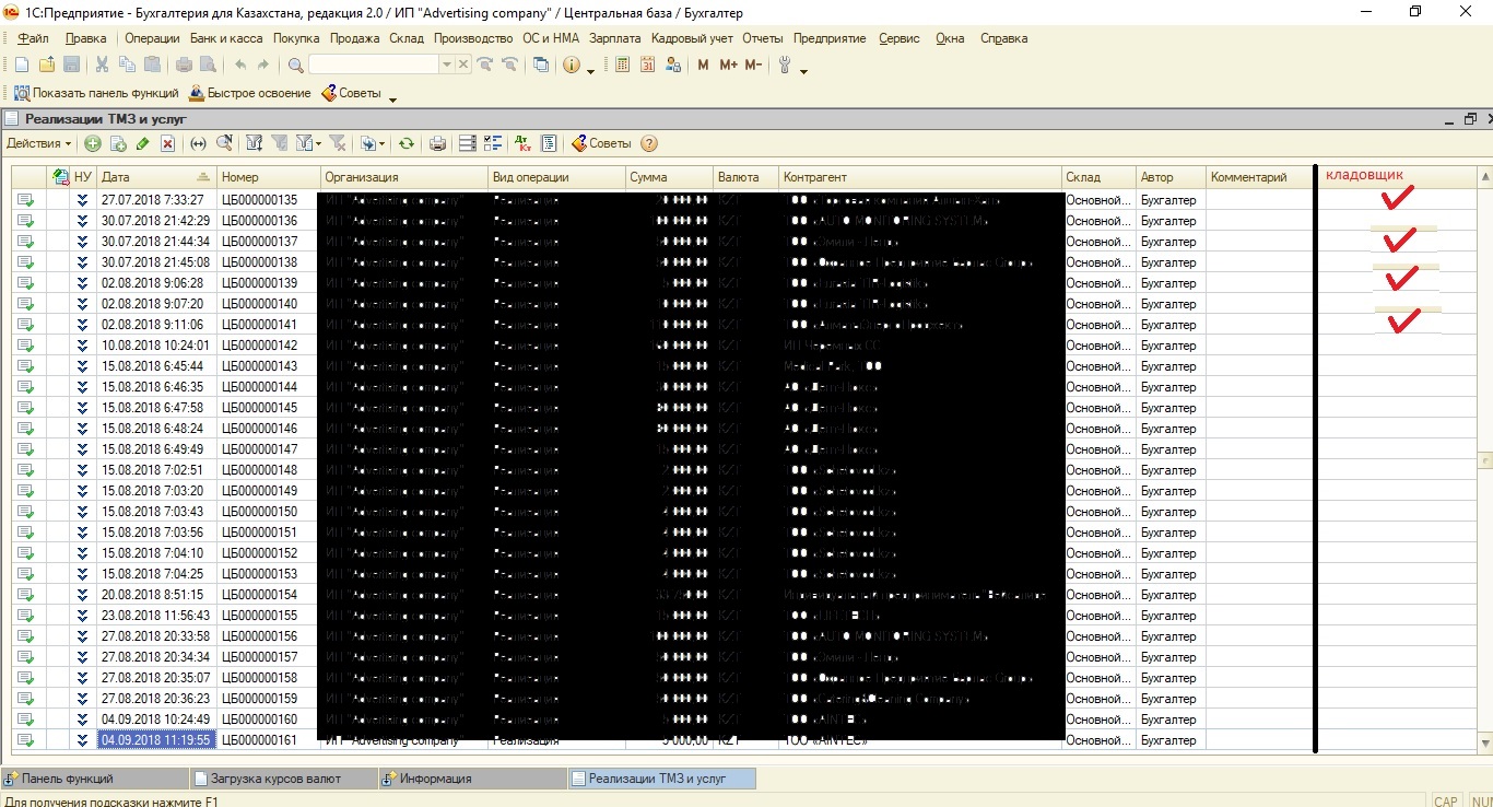 В списке реализация документов нужно добавить колонку дополнительную рядом с колонкой комментарий к примеру «Кладовщик». (см.рис. кладовщик (галочки) ).