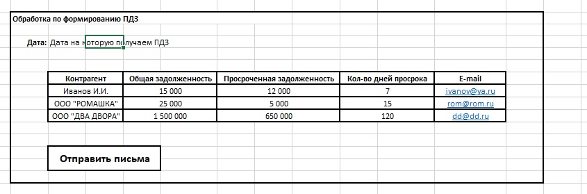 Общий алгоритм работы: на указанную дату заполняем таблицу данными ПДЗ. При нажатии кнопки "Отправить письма" проходим по списку и отправляем письмо(для отправки использовать системную учетную запись электронной почты 1С) с таки данными: тема - "Дебиторская задолженность", тест- "За вами числится задолженность в размере "Общая сумма задолженности". Из них просрочено "Сумма просроченной задолженности". Количество дней просрочки - "количество дней просрочки". Просим Вас в течении 3-х дней погасить имеющуюся задолженность.