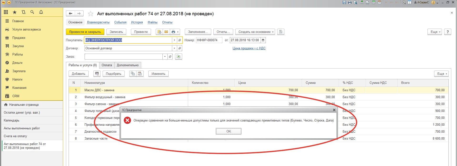 Автосервис (1.6.4.19) - на базе УНФ 1.6 ошибка при проведении Акта выполненных работ