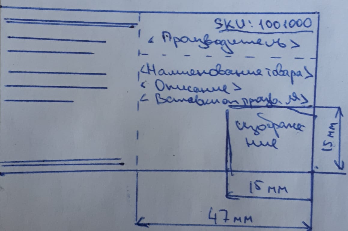 Остальное поле этикетки 46*40 - горизонтально ориентировано. Там текст - название товара, описание и т.д. (теги и шрифт предоставлю в процессе)