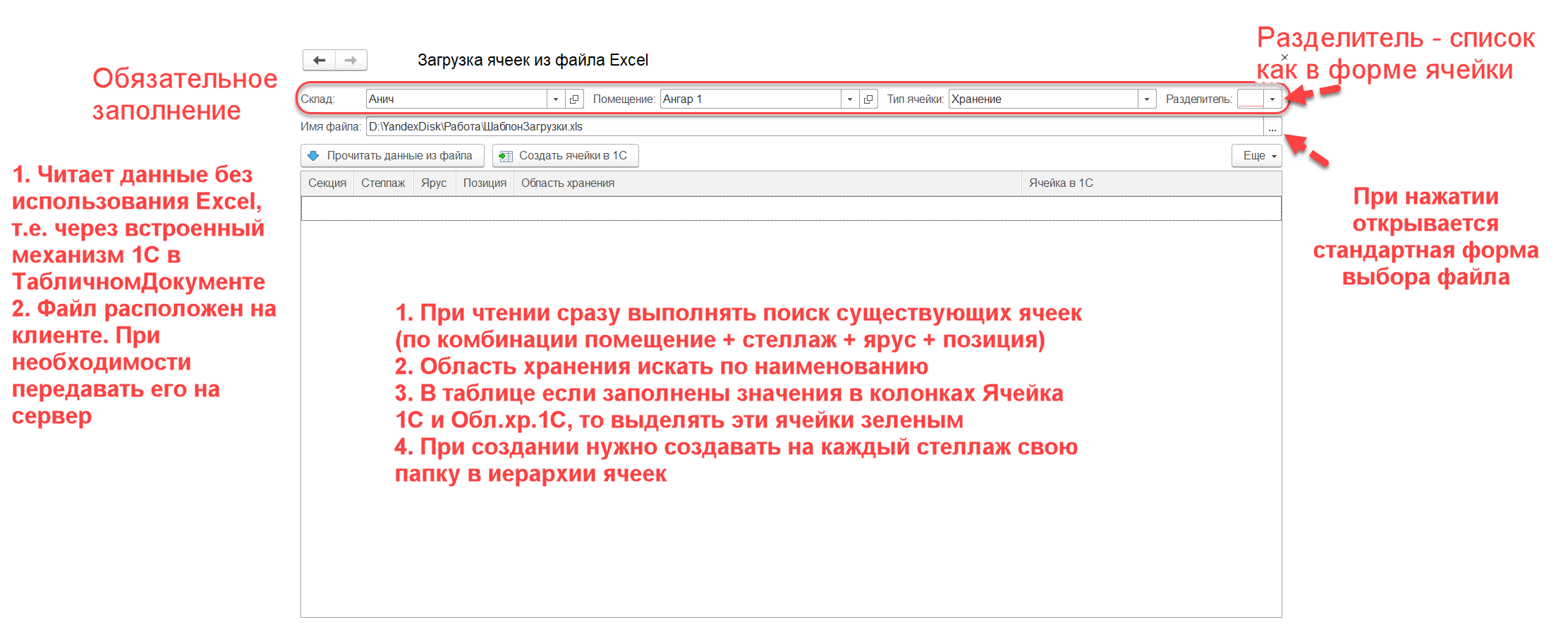 Для упрощения ввода не стандартных стеллажей необходимо предусмотреть обработку загрузки ячеек из файла Excel.