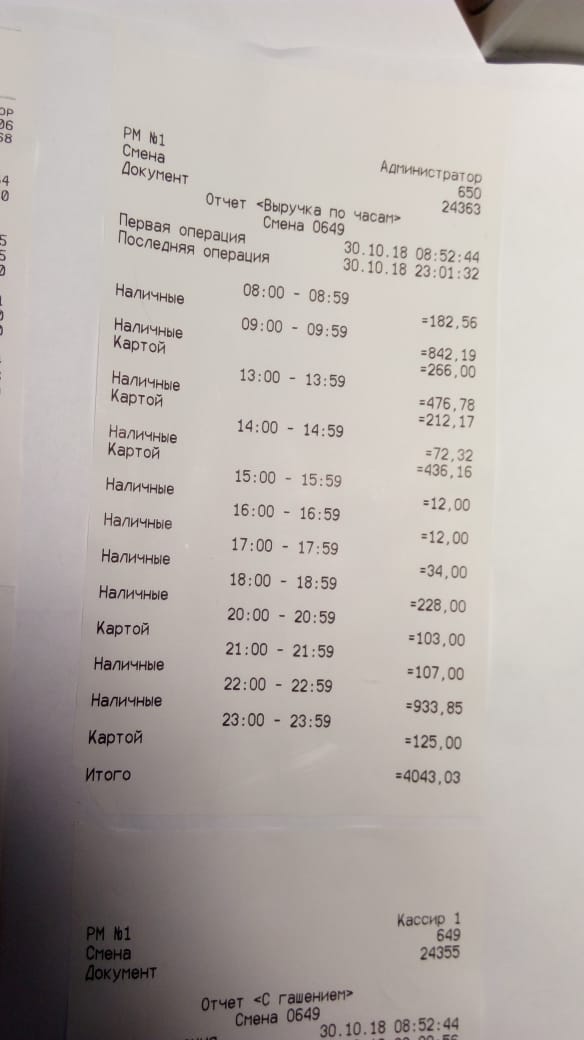 Суммы оплат ЧековККМ с разбивкой по часам, и по типам оплаты.