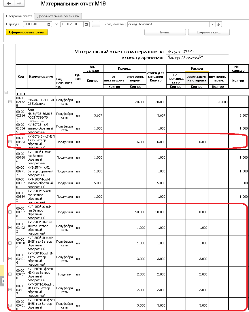 - в отчет "М19а" при активном флажке должны попасть только строки в колонках которых есть расход -реализация на сторону
