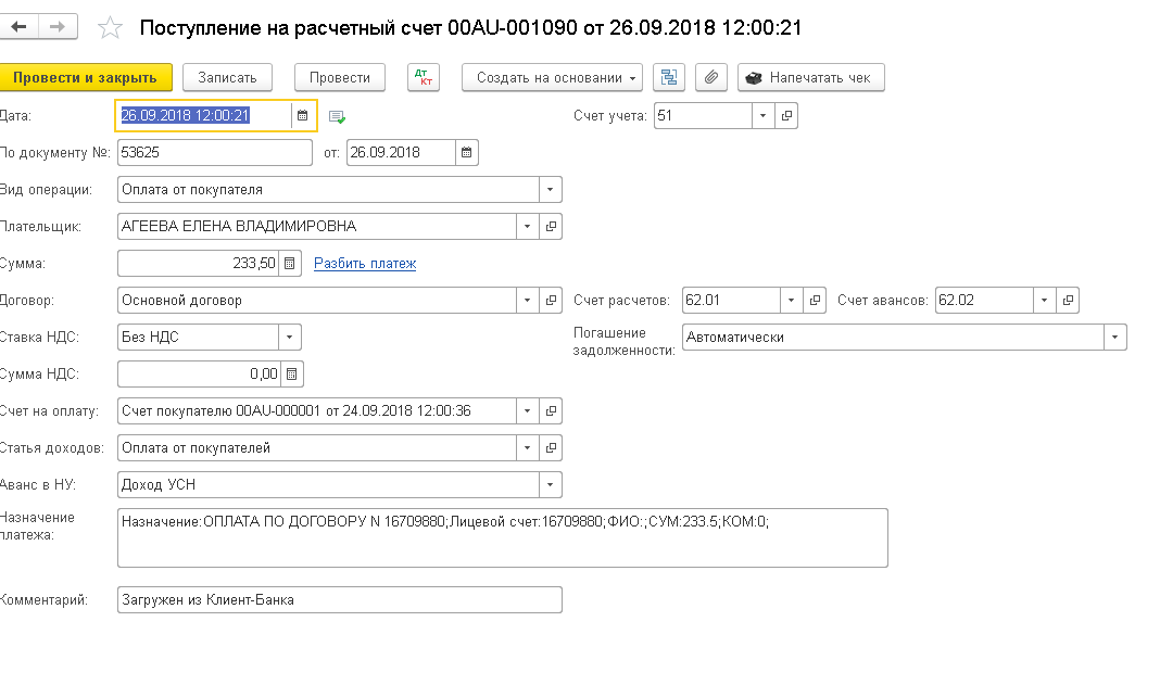 Сделать обработку по созданию док.Реализация (скриншот2) из Поступление на расчетный счёт (скриншот1).