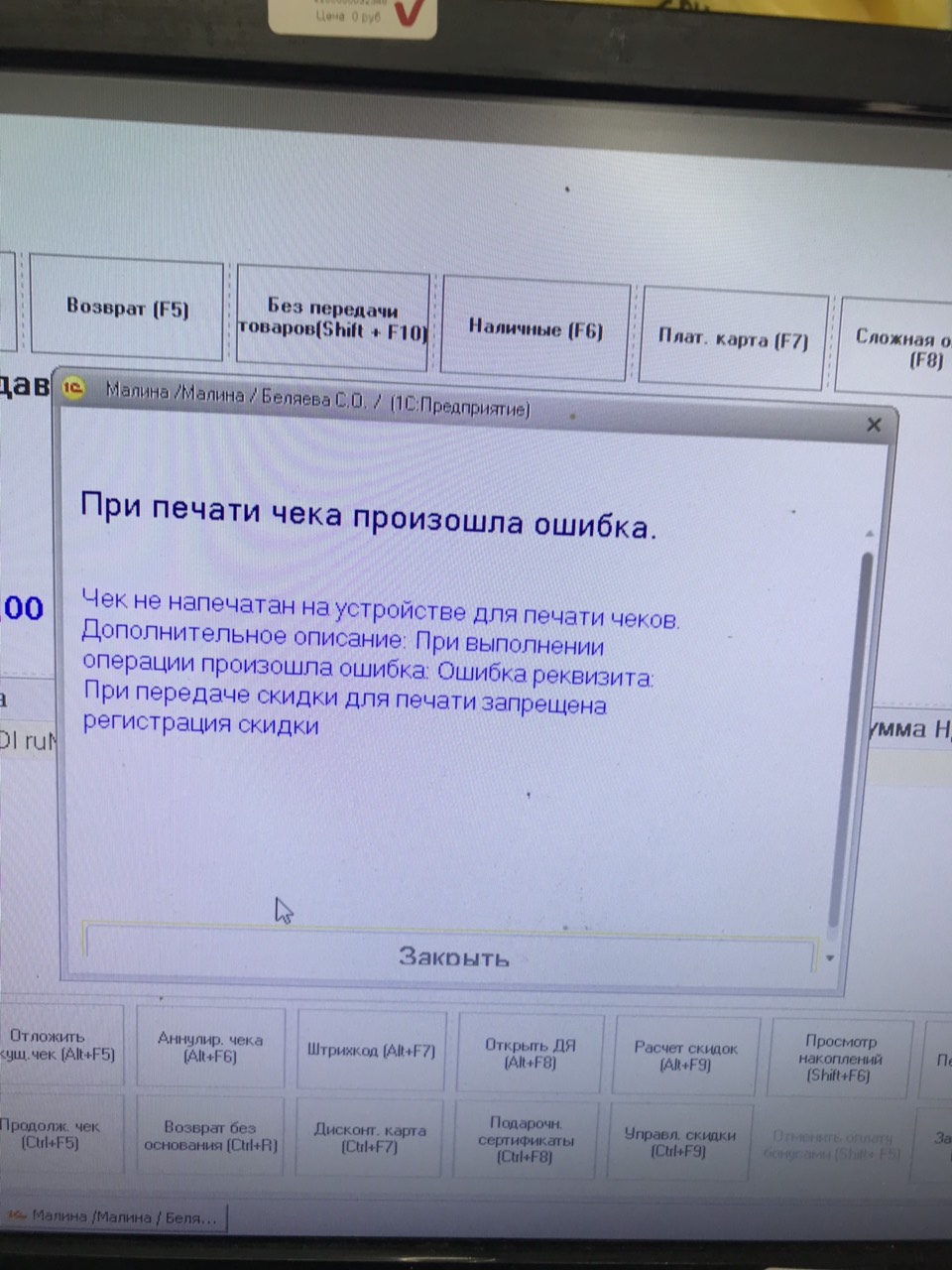 У нас Розница, перепрошили кассовый аппарат. установили проверили работает. А когда на следующий день пробили скидку то беда. пишет ошибку фото прилагаю