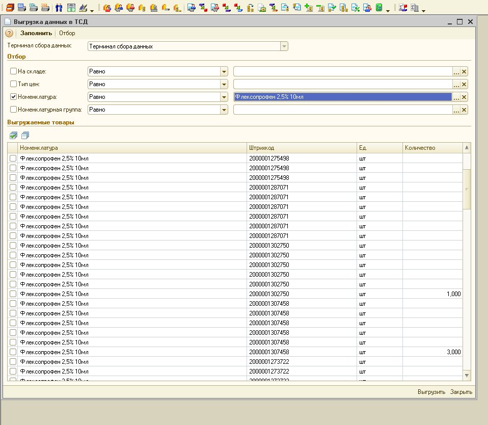 После очередного обновления (по-моему это было 10.3.48.1) штатная обработка выгрузки в ТСД перестала правильно формировать спиок для выгрузки в ТСД. Теперь каждый из штрих-кодов товаров присутсвует в списке множество раз, вместо одного (как ранее)