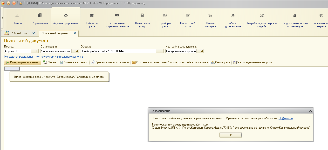 После обновления перестал работать доработанный отчет "Платежный документ" в конфигурации 1С:Учет в управляющих компаниях ЖКХ, ТСЖ и ЖСК.