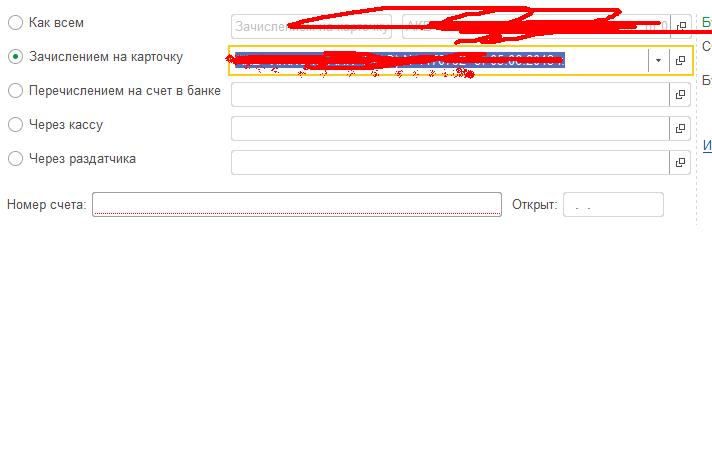 Требуется обработка перебора регистра сведений "ЛицевыеСчетаСотрудниковПоЗарплатнымПроектам" и установка значения "Зачислением на карточку" в карточке сотрудников не закладке "Выплата, учет затрат". Заполнение значений "Зачислением на карточку", "Номер счета" и "Дата открытия" берем из регистра. См. приложенный скрин.