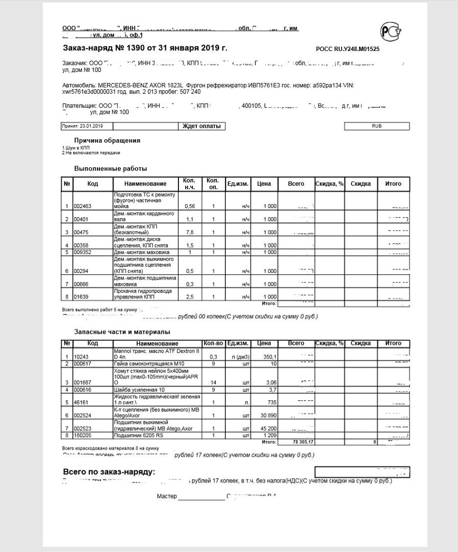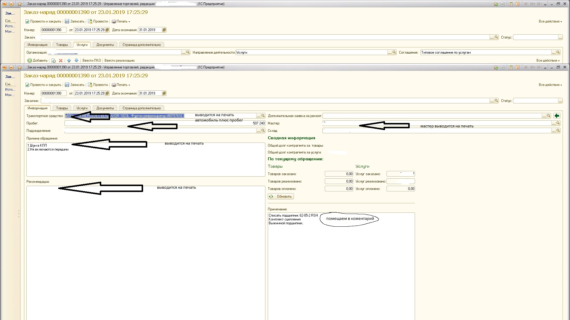 - в том же документе заказ-наряд на вкладке главное (или добавить новую вкладку) разместить информацию по транспортному средству, пробег, причина обращения, рекомендации, примечание переводим в комментарий, мастер (все показано на скриншоте);