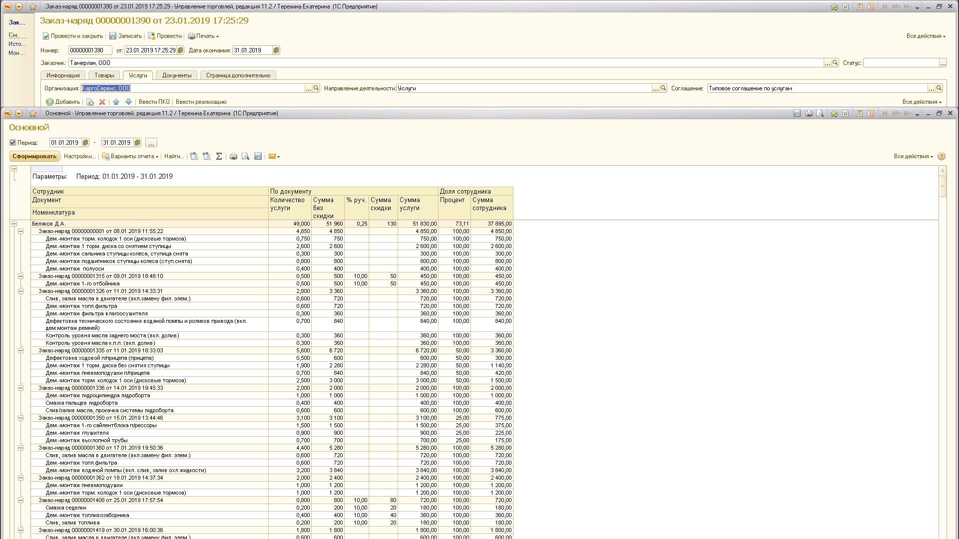 - в документе заказ-наряд на вкладке работы дописать возможность выбора исполнителя с % его участия в этой работе (примерно как должно выглядеть показано на скриншоте);