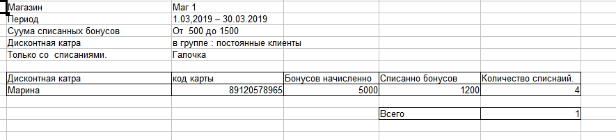 Дисконтная катра ; код карты ; Бонусов начисленно; Списанно бонусов; Количество списнаий