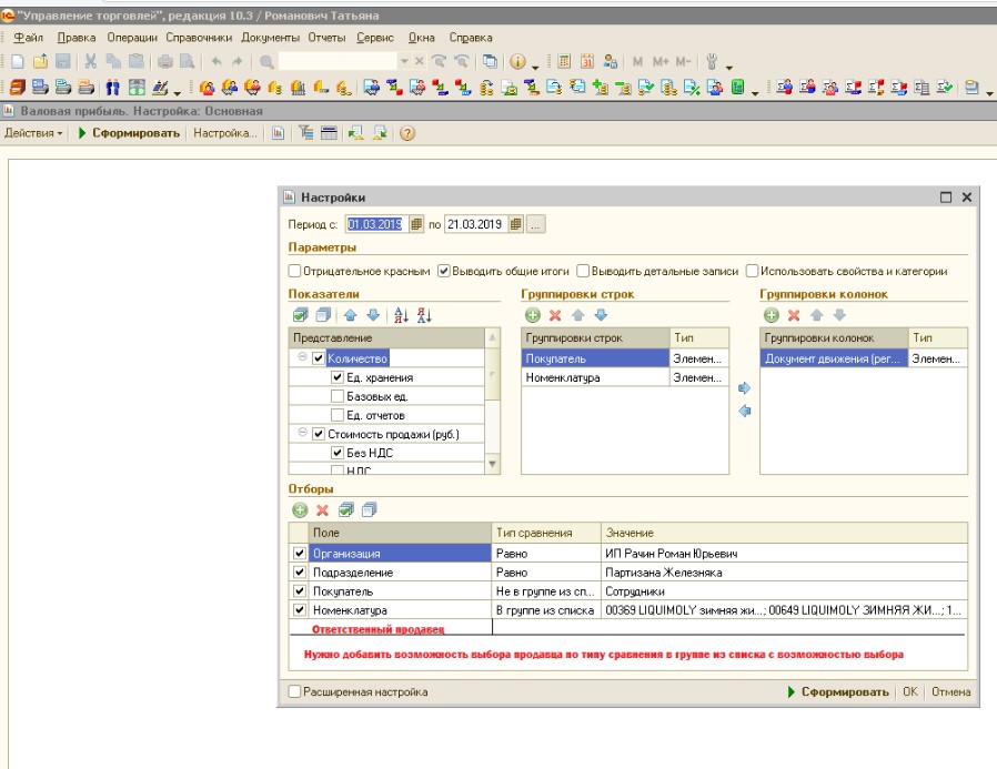 В отчет "Валовая прибыль" нужно добавить возможность выбора по типу сравнения в группе из списка с возможностью выбора.
