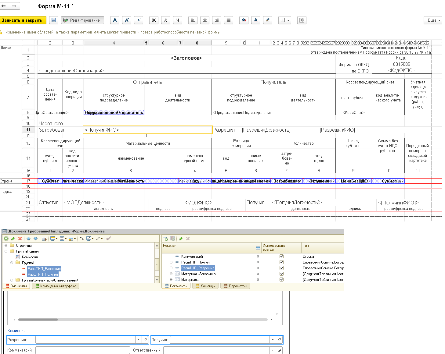 Создать расширение к документу Требование-накладная с добавлением реквизитов Получил и Разрешил с подстановкой в печатную форму м-11, в соответствующие ячейки шаблона