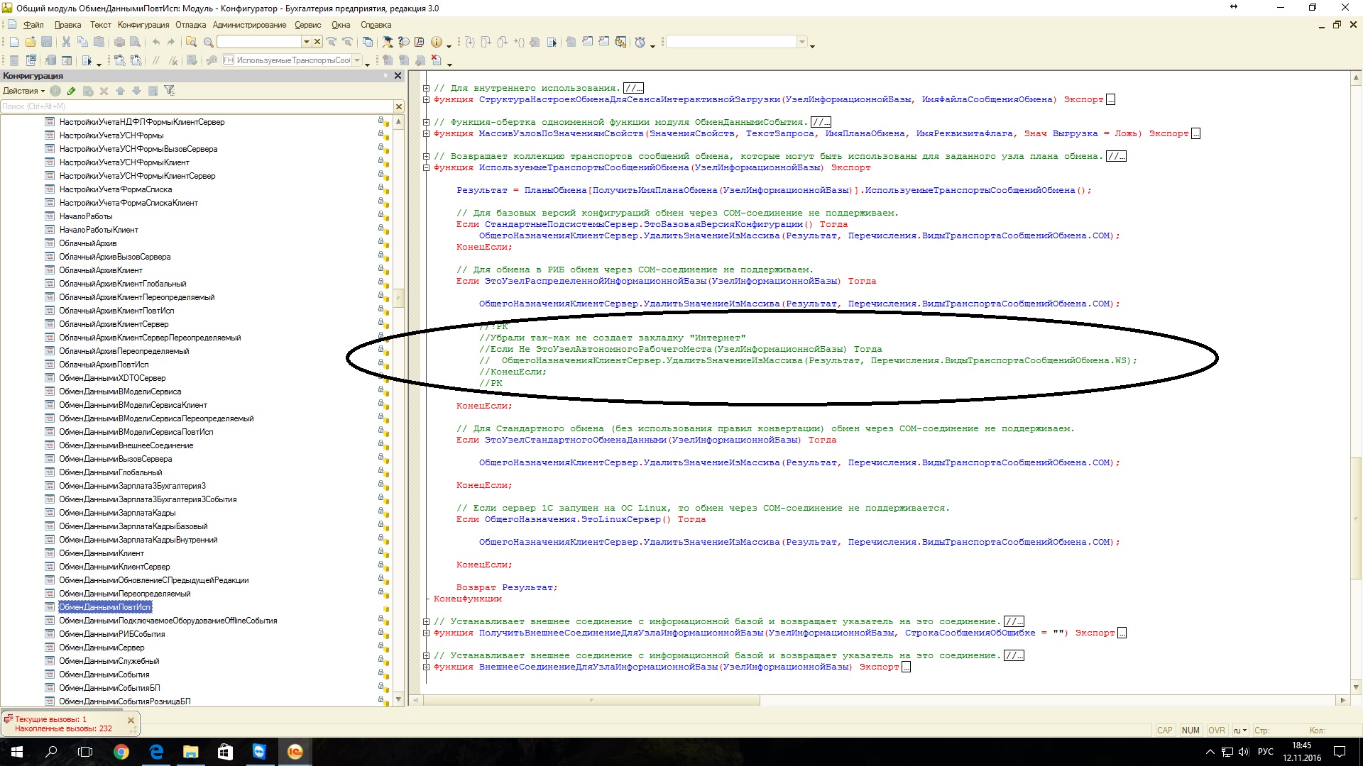 До новых версий УТ11 мы использовали в качестве транспорта РИБ web-сервер. Было очень удобно. Закоментировали небольшой кусочек кода (см. скрин old) в результате в настройках транспорта обмена появлялась вкладка "интернет" и всё работало отлично. Теперь этот модуль немного переработали (см. скрин new), и обмен через WS парестал работать. Точнее работает до открытия кассовой смены, потом перестаёт.