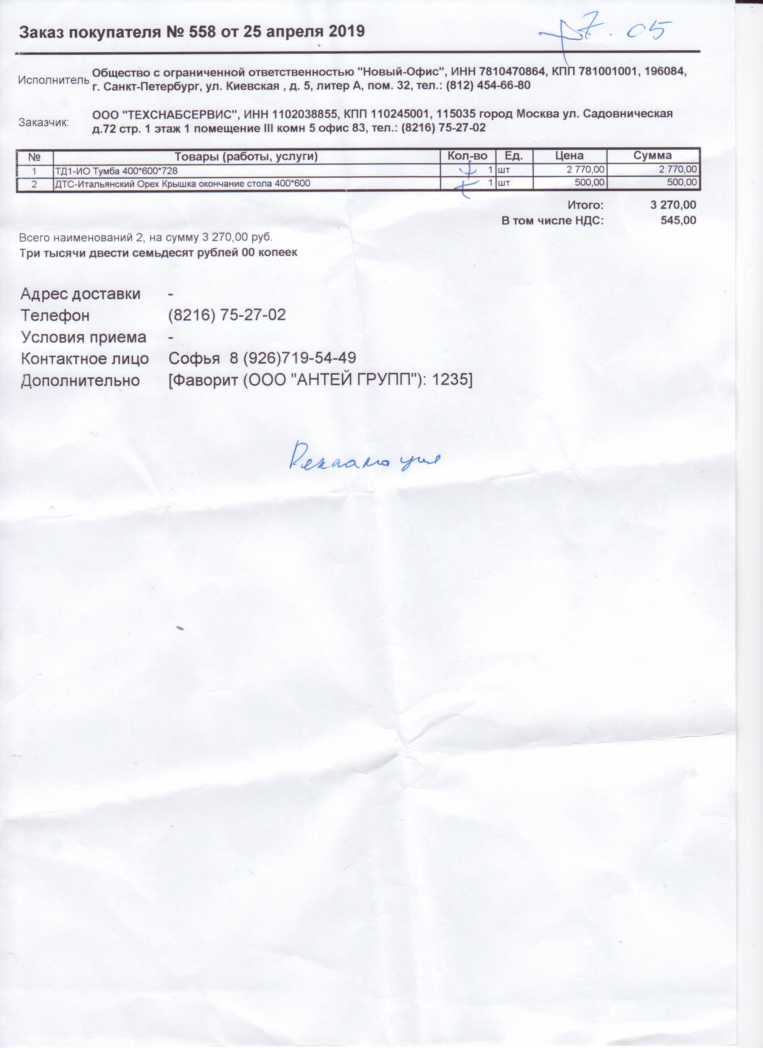 Адрес доставки: Берется адрес контрагента