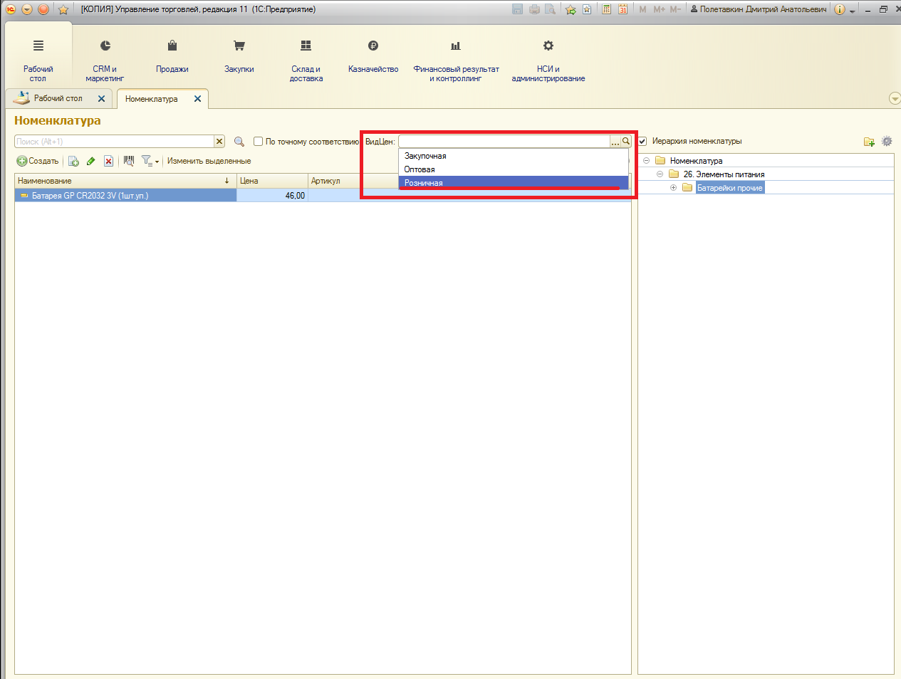 1. При открытии справочника "Номенклатура" у элемента основной формы ВидЦен по умолчанию должна стоять цена "Розничная".