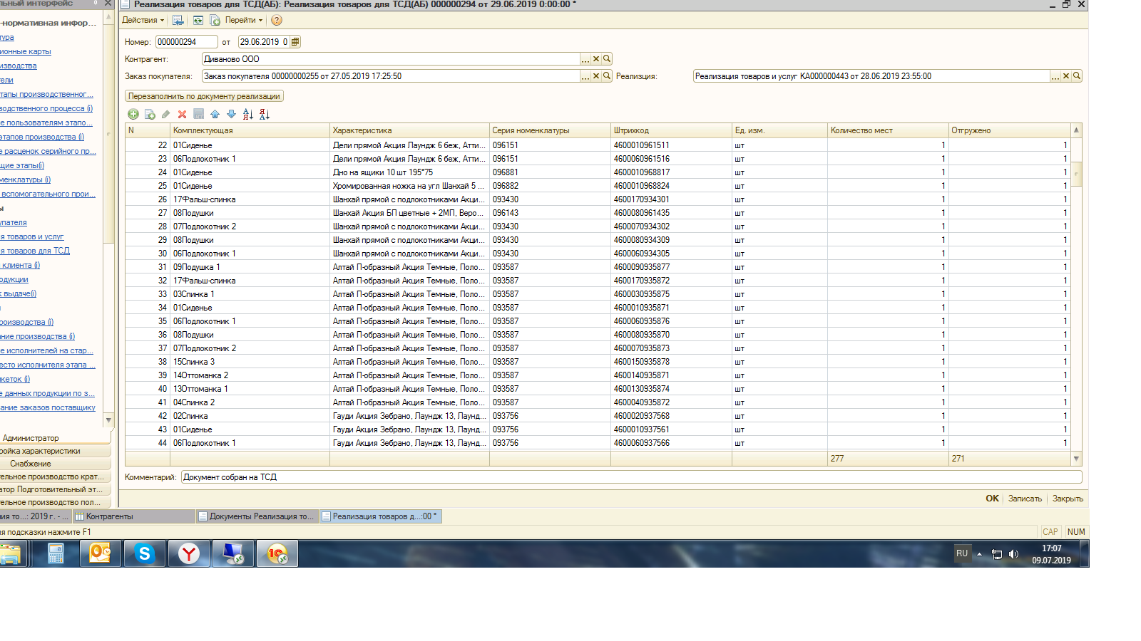 В 1с формируется разгруппированный список отгрузки из деталей нашей продукции, список составляет примерно 350-400 строк, у каждой строки свой уникальный штрихкод. Далее этот список попадает в ТСД по процессу «Подбор Заказа», по нему идет отгрузка со склада.