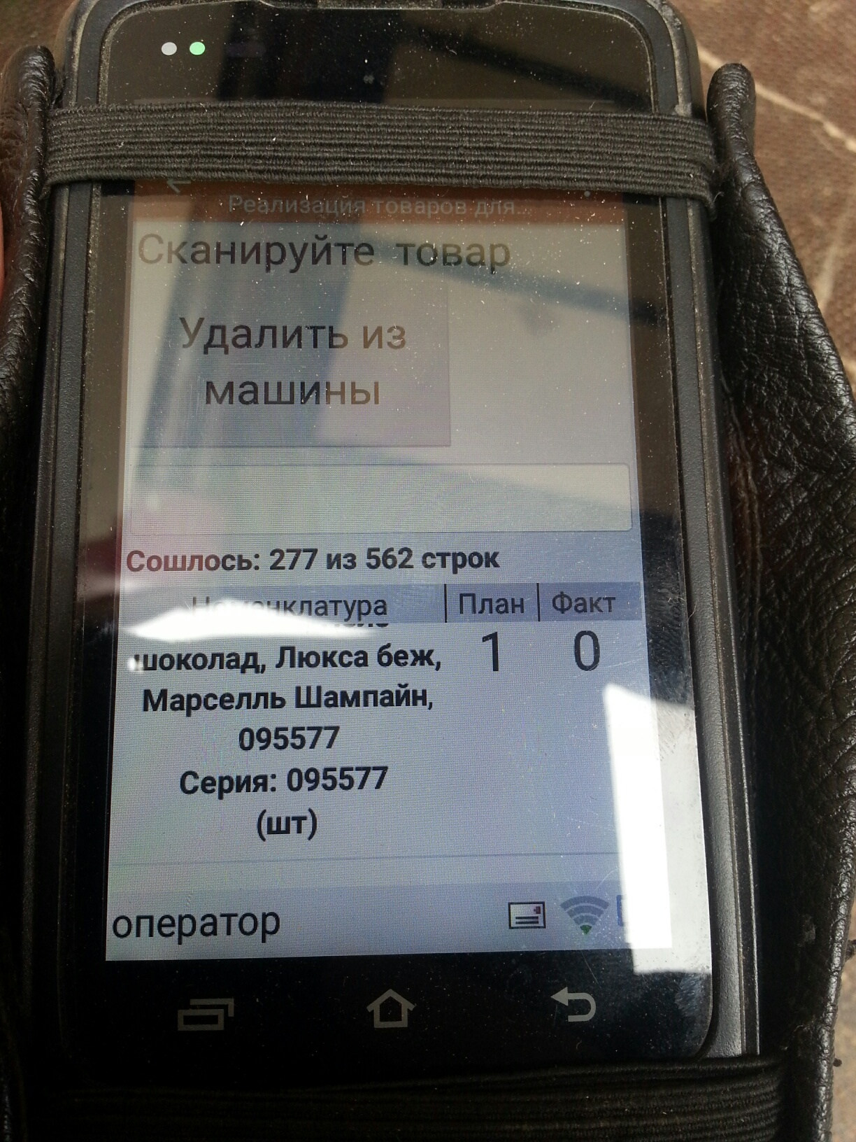 Дальше скрин с ТСД, бликует но в целом понятно, колонки "Комплектующая, Характеристика, Серия Номенклатуры" лежат в одной строке, план и факт это колонки "Количество мест" и "Отгружено" из 1с соответственно.