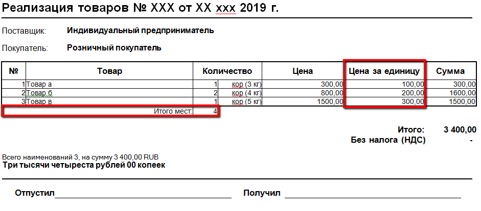 Необходимо в типовую печатную форму "Реализация товаров и услуг" добавить колонку "Цена за единицу", где будет указываться цена за единицу хранения. Так же нужно добавить строку с итоговым количеством упаковок. Готовый вариант во вложении.