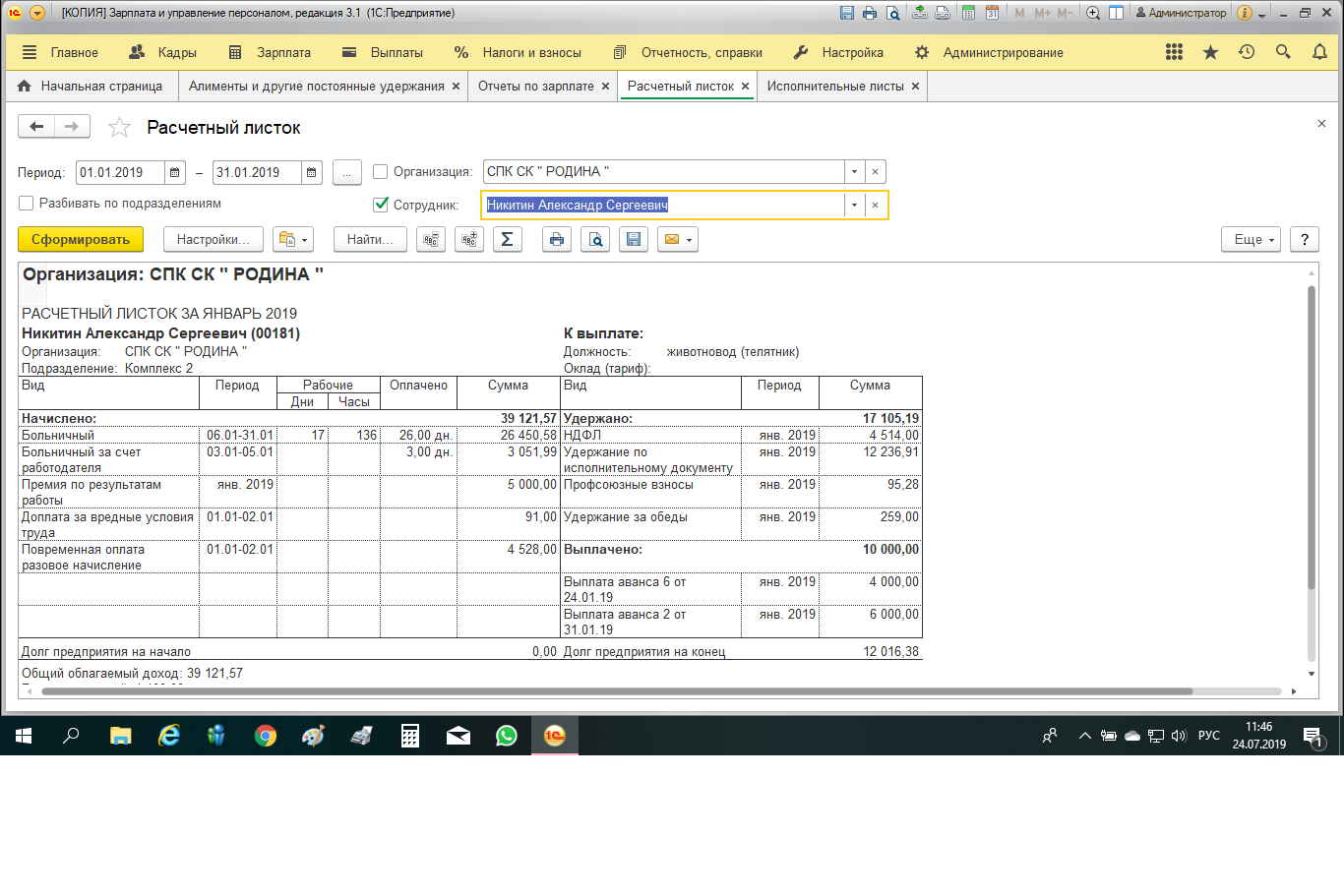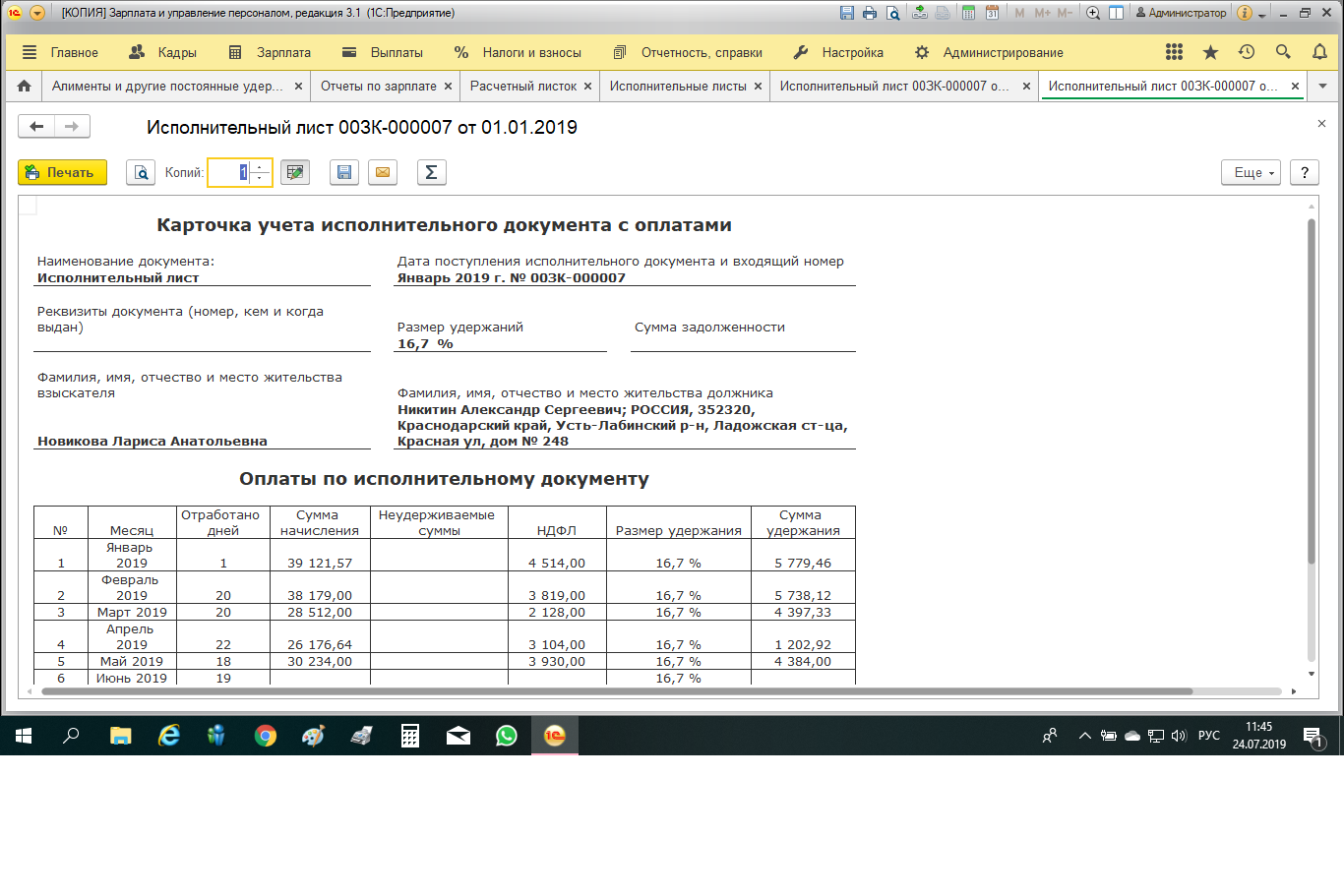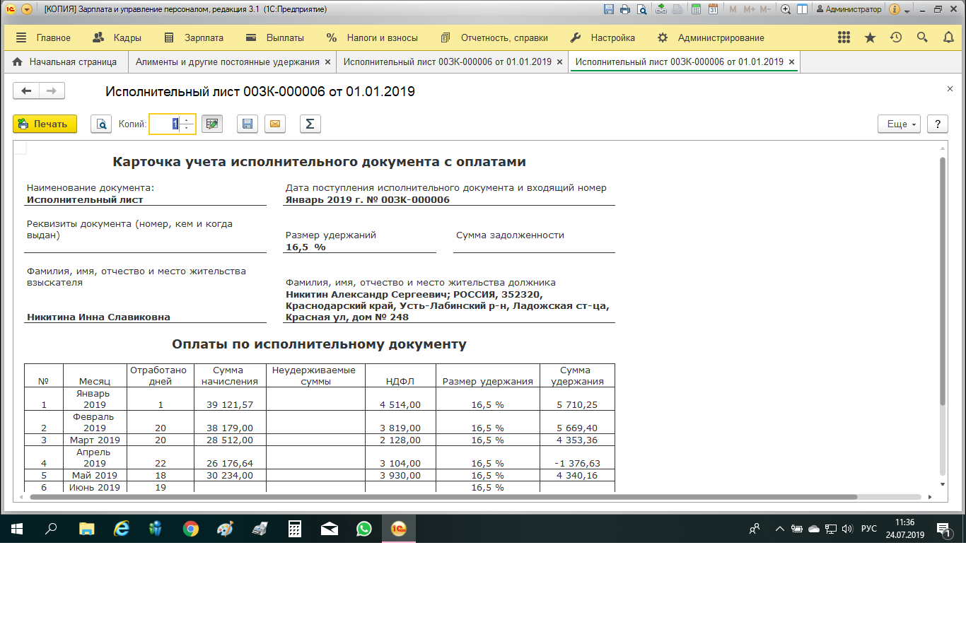 Есть расхождения в сумме алиментов на одного из детей (% алиментов 16.5)в карточке учета исп-х документов с оплатами(в ней верно все) и в расчетном листке(в нем ошибка). На одного из детей(Нина) на сумму разового начисления 4528 (это видно в расчетном листке) дважды берутся алименты. Разовое начисление стандартное, код дохода 2000.Ндфл верный в расчетном листке. Вопрос по алиментам января.
