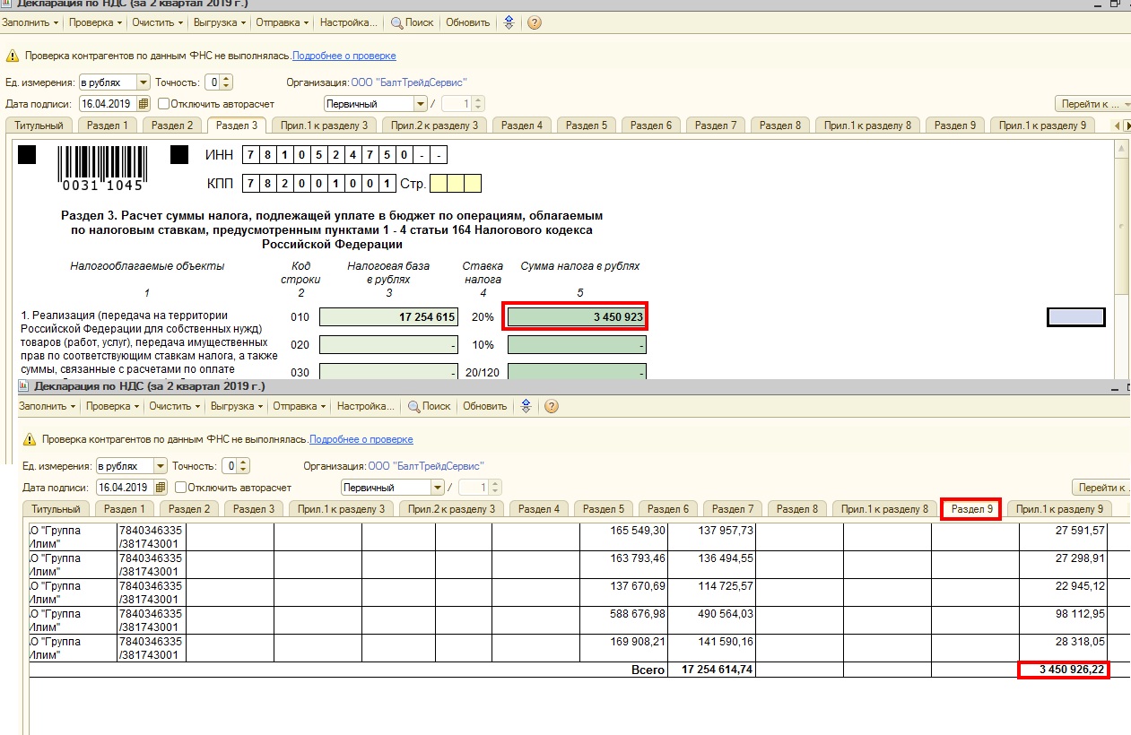В декларации по НДС за 2 кв 2019 по имеются расхождения в Разделе 3 строка 010 графа 5 (3 450 923 руб) и в Разделе 9 строка Всего по графе 17 (3 450 926, 22 руб) Расхождение в 3 рубля, но налоговая уже не принимает, а за 3 и 4 кв расхождение будет больше (так было в 2018 году по крайней мере). Нужно выяснить почему получается такое расхождение и что можно сделать. Во вложении файл с примером расхождения сумм. Ссылка на базу https://dropmefiles.com/k2Spi пользователь Admin пароль 1234