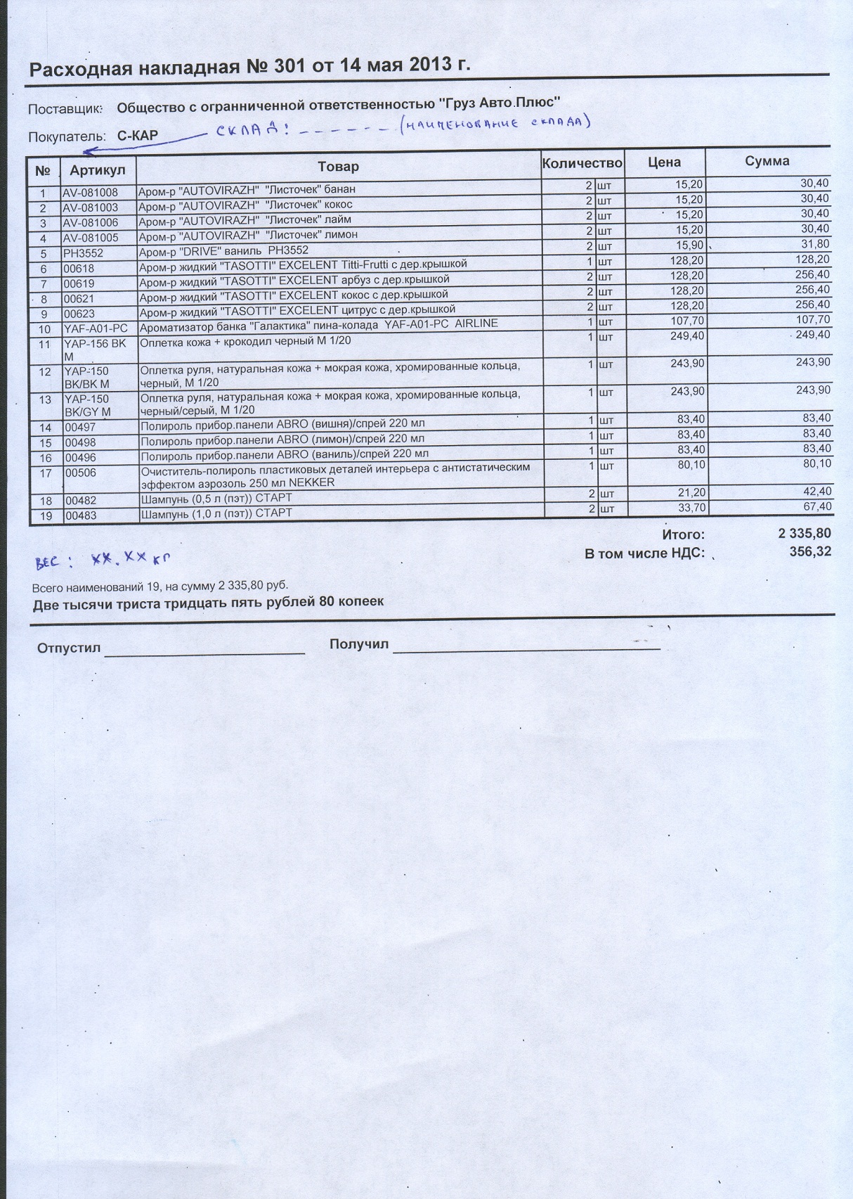 Нужно изменить петчатную форму "Расходной накладной". Конфигурация 1С УТ 10.3. Скрин формы в приложении. Описание изменений: поле "СКЛАД" нужно взять из шапки накладной. "Итого вес :" нужно взять из номенклатуры, основной единицы измерения поле "вес" по всей накладной .