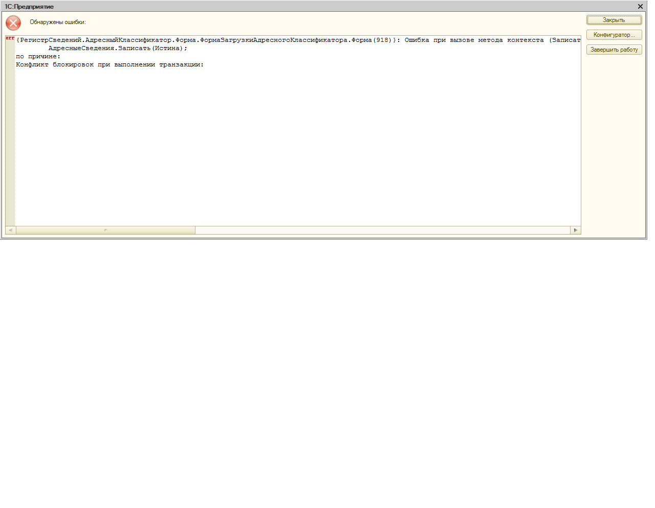 Во время обновления КЛАДР произошла ошибка, теперь при попытке что-либо сделать в КЛАДР (обновить, очистить, удалить или открыть отдельную запись), возникает ошибка "Конфликт блокировок при выполнении транзакции". Необходимо исправить через удаленный доступ, либо описать способ устранения.