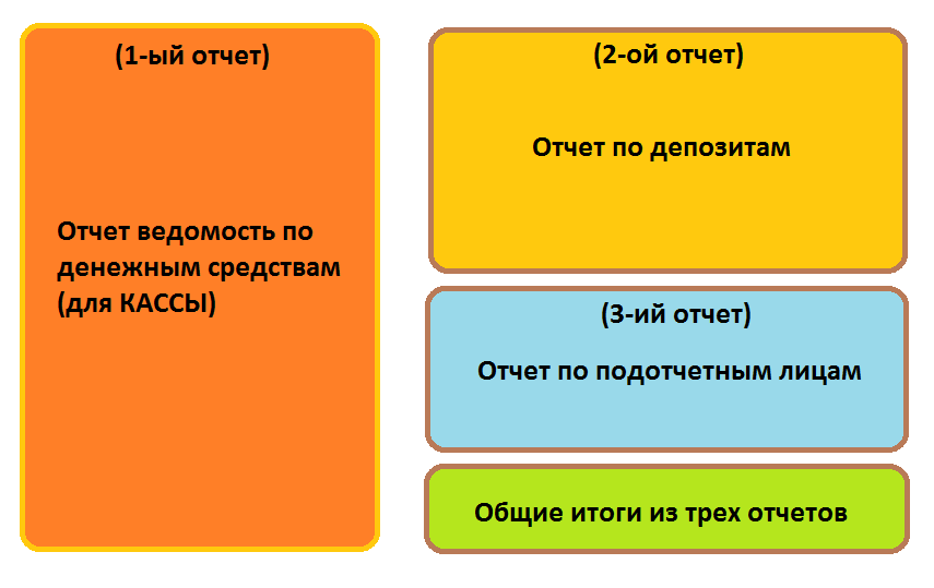 Конфигурация 11.3.2.183, работает на MSSQL. Есть два внешних отчета и один типовой со своей настройкой(ведомость по денежным средствам). Нужно создать один отчет, в котором будет типовой отчет слева, один из внешних справа, а второй внешний - ниже первого внешнего.