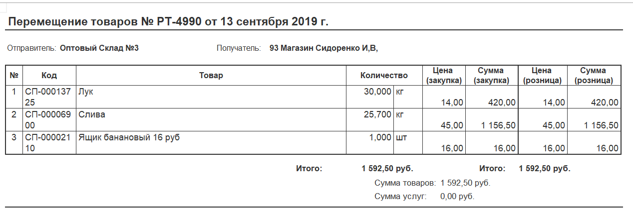 Сделать внешнюю печатную форму для документа Передача товара в 1С Розница по образцу.