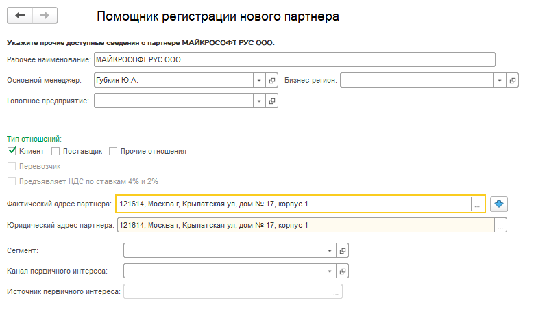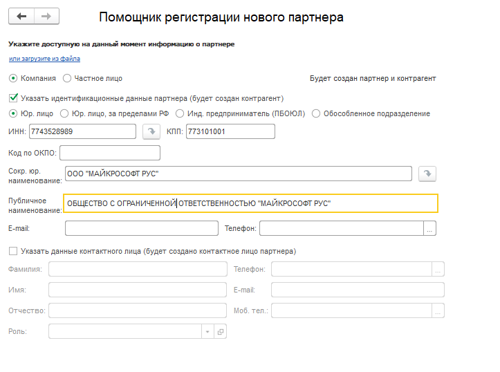 - заполнение должно быть доступно в форме создания нового Контрагента и в форме Помощника регистрации нового Партнера