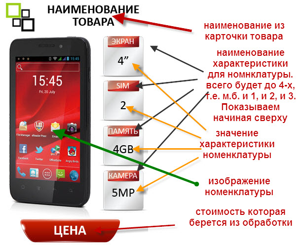 - тело: картинка номенклатуры, а с правой стороны свойства номенклатуры, их будет до 4-х шт.(Свойства короткие, состоят из одного слова, будет картинка подложка, разделенная на две части, вверху название свойства, внизу значение, напр. для телефона это будет свойство:SIM, значение:2)
