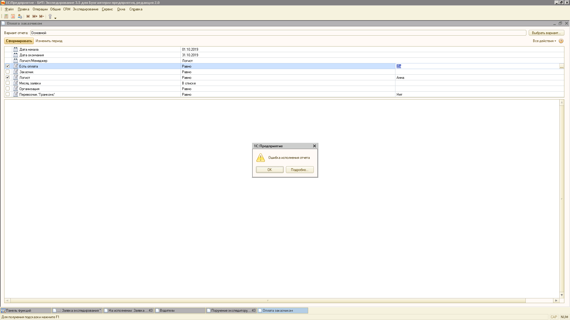Есть отчет оплата заказчиком, отчет формируется с 01.10.19 по 28.10.19 и с 30.10.19 по 31.10.19 (и на другие даты тоже).