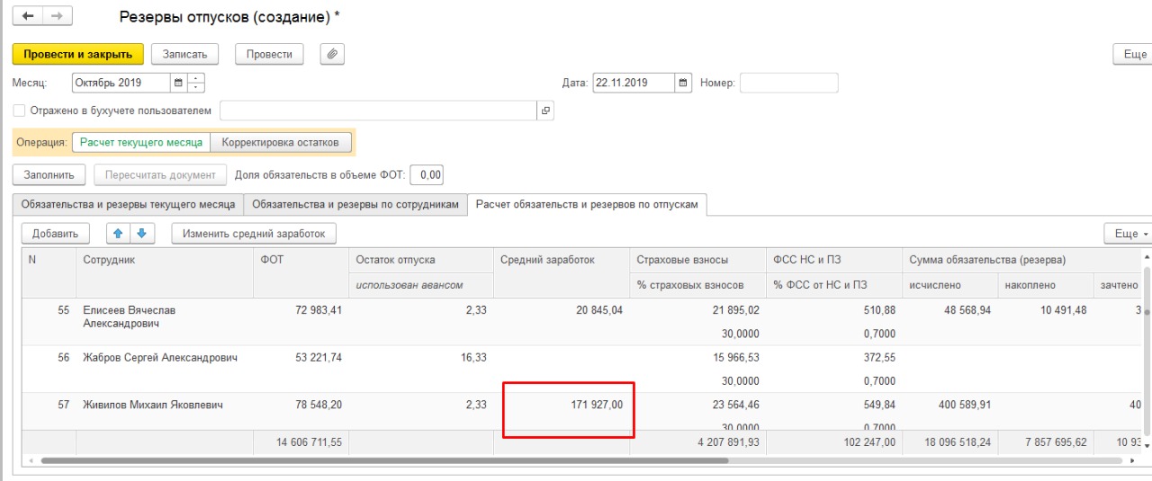 Задача: при заполнении документа "Начисление оценочных обязательств" неправильно считает, по некоторым сотрудникам неверно считает среднюю и соответственно резервы. Надо выяснить в чем причина, что сделать чтобы считалось корректно