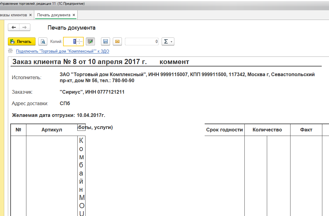 Есть 2 печатные формы счета из Заказа клиента - Заказ клиента и Заказ клиента с суммой.