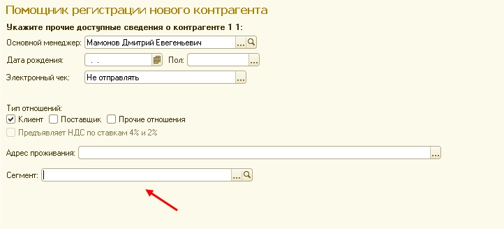 Поле "сегмент" при создании контрагента сделать обязательным к заполнению